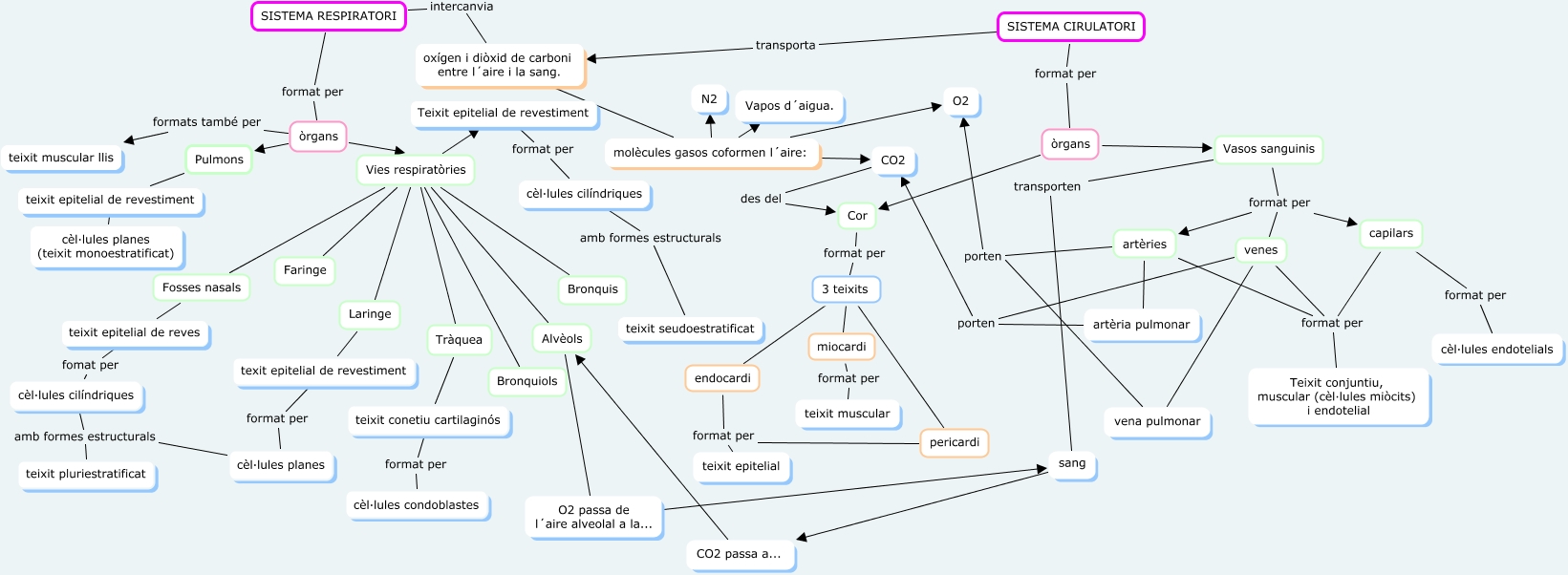 Este Cmap, tiene información relacionada con: Sin Título 1, òrgans formats també per teixit muscular llis, Vasos sanguinis format per capilars, SISTEMA RESPIRATORI format per òrgans, Vies respiratòries Laringe, Vasos sanguinis format per artèries, Pulmons teixit epitelial de revestiment, Tràquea teixit conetiu cartilaginós, Laringe texit epitelial de revestiment, texit epitelial de revestiment format per cèl·lules planes, capilars format per Teixit conjuntiu, muscular (cèl·lules miòcits) i endotelial, cèl·lules planes amb formes estructurals teixit pluriestratificat, venes format per Teixit conjuntiu, muscular (cèl·lules miòcits) i endotelial, òrgans Cor, Vies respiratòries Faringe, Vies respiratòries Fosses nasals, SISTEMA RESPIRATORI intercanvia oxígen i diòxid de carboni entre l´aire i la sang., òrgans Vies respiratòries, Vasos sanguinis transporten sang, CO2 des del Cor, SISTEMA CIRULATORI transporta oxígen i diòxid de carboni entre l´aire i la sang.