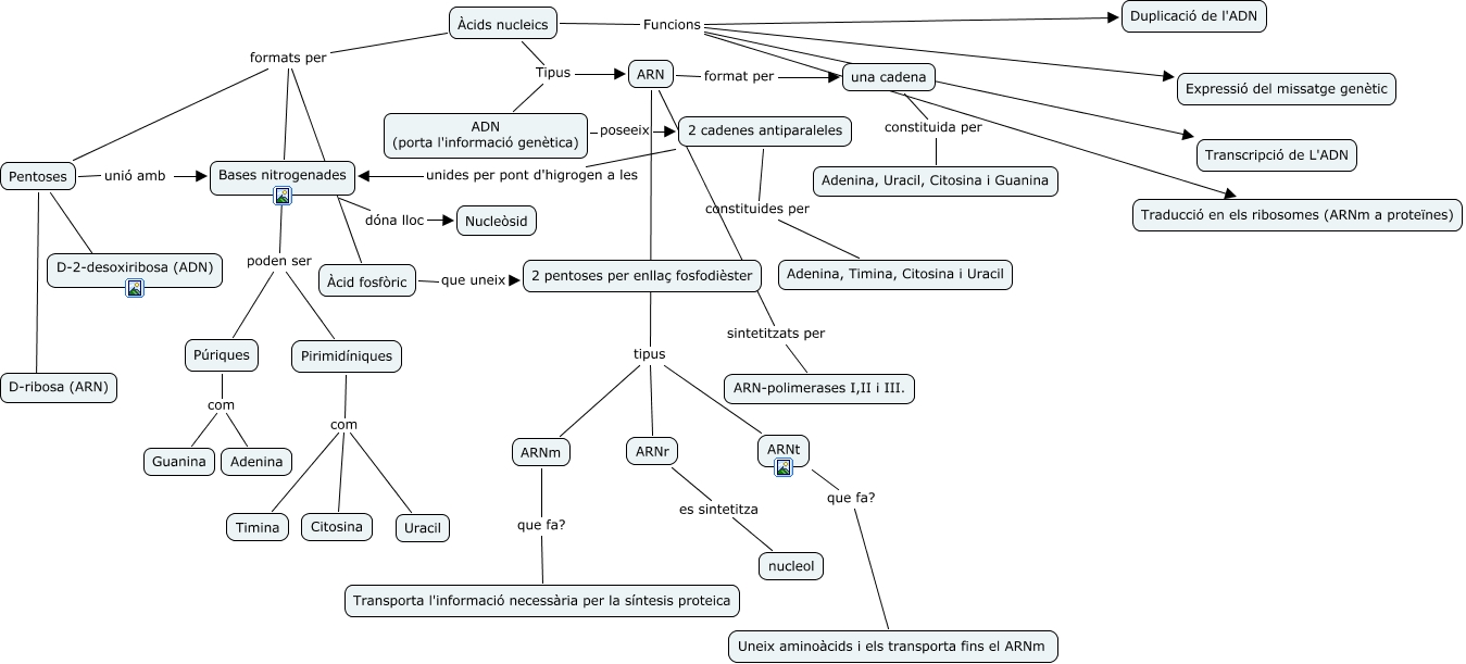 Este Cmap, tiene información relacionada con: acids_nucleics-2.cmap(+ recursos), Àcids nucleics Funcions Duplicació de l'ADN, Bases nitrogenades poden ser Púriques, ARNt que fa? Uneix aminoàcids i els transporta fins el ARNm, Pentoses ???? D-ribosa (ARN), Àcids nucleics formats per Àcid fosfòric, Púriques com Adenina, una cadena constituida per Adenina, Uracil, Citosina i Guanina, Àcids nucleics Funcions Transcripció de L'ADN, ARNm que fa? Transporta l'informació necessària per la síntesis proteica, Pentoses ???? D-2-desoxiribosa (ADN), Púriques com Guanina, ARNr es sintetitza nucleol, Pirimidíniques com Timina, Àcids nucleics Funcions Expressió del missatge genètic, Pirimidíniques com Uracil, Bases nitrogenades dóna lloc Nucleòsid, ADN (porta l'informació genètica) poseeix 2 cadenes antiparaleles, Àcids nucleics formats per Bases nitrogenades, Àcids nucleics Tipus ADN (porta l'informació genètica), ARN sintetitzats per ARN-polimerases I,II i III.
