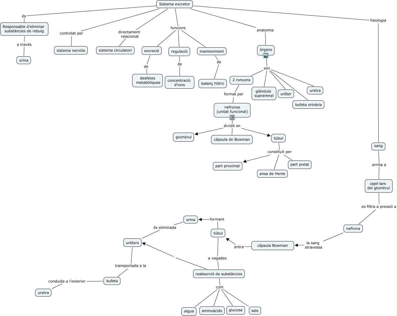 Este Cmap, tiene información relacionada con: sistema excretor. BL-M. Grup 2. Jaume Bonet, capil·lars del glomèrul es filtra a pressió a nefrona, Sistema excretor directament relacionat sistema circulatori, nefrones (unitat funcional) dividit en glomèrul, Sistema excretor fisiologia sang, Sistema excretor controlat per sistema nerviós, túbul a vegades reabsorció de substàncies, reabsorció de substàncies com sals, uretra són bufeta orinària, bufeta conduida a l'exterior uretra, excreció de desfetes metabòliques, tùbul constituit per part proximal, Sistema excretor és Responsable d'eliminar substàncies de rebuig, uretra són glàndula suprarenal, orina és eliminada urèters, reabsorció de substàncies urèters, Sistema excretor funcions excreció, òrgans són urèter, urèters transportada a la bufeta, reabsorció de substàncies com aminoàcids, nefrona la sang atravessa càpsula Bowman